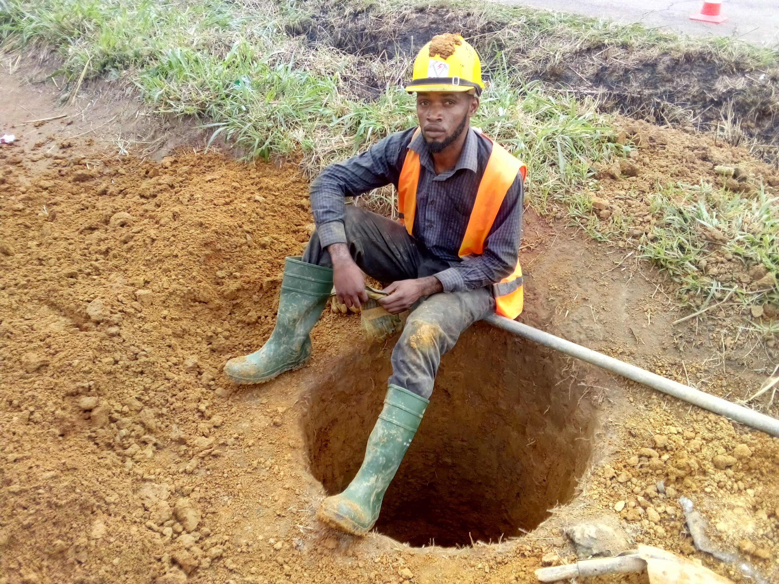 Le technicien Ebang Zué Yvon au milieu d’un trou d’environ un mètre, d’abord pour mettre en place un transformateur