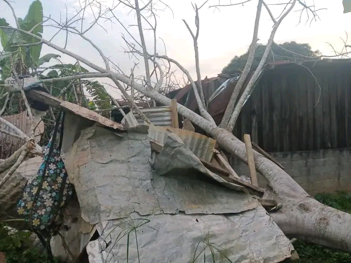 Vendredi 05décembre 2025 à 17 heures au quartier Camp de bonheur, en raison d’un fort coup de vent, un arbre d’une dizaine de mètres de haut est tombé sur la maison de Marguerite Manga, enseignante à l’école publique de la capitale départementale de la Louetsi-wano au sud du Gabon.