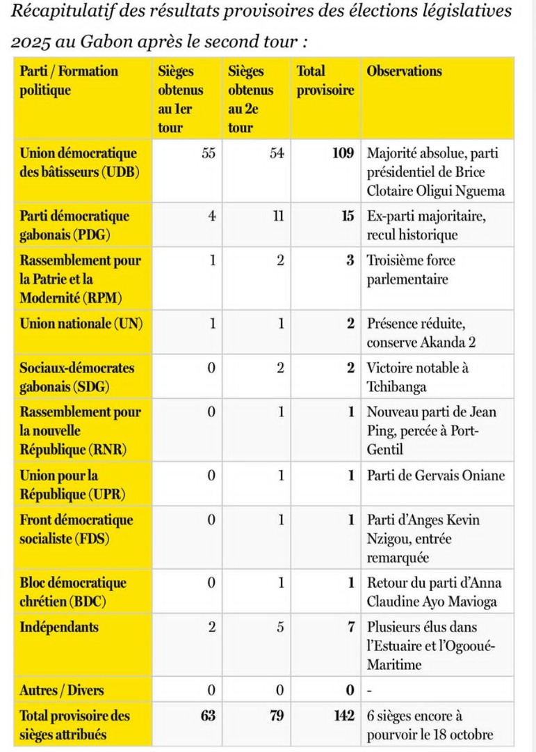 L’Union Démocratique des Bâtisseurs (UDB) a remporté une victoire historique et totale dans la province du Woleu-Ntem, obtenant les 18 sièges de députés. Ce succès est attribué au leadership stratégique et charismatique du duo formé par Aurélien Mintsa Mi Nguema et Bertrand Zibi Abegue.